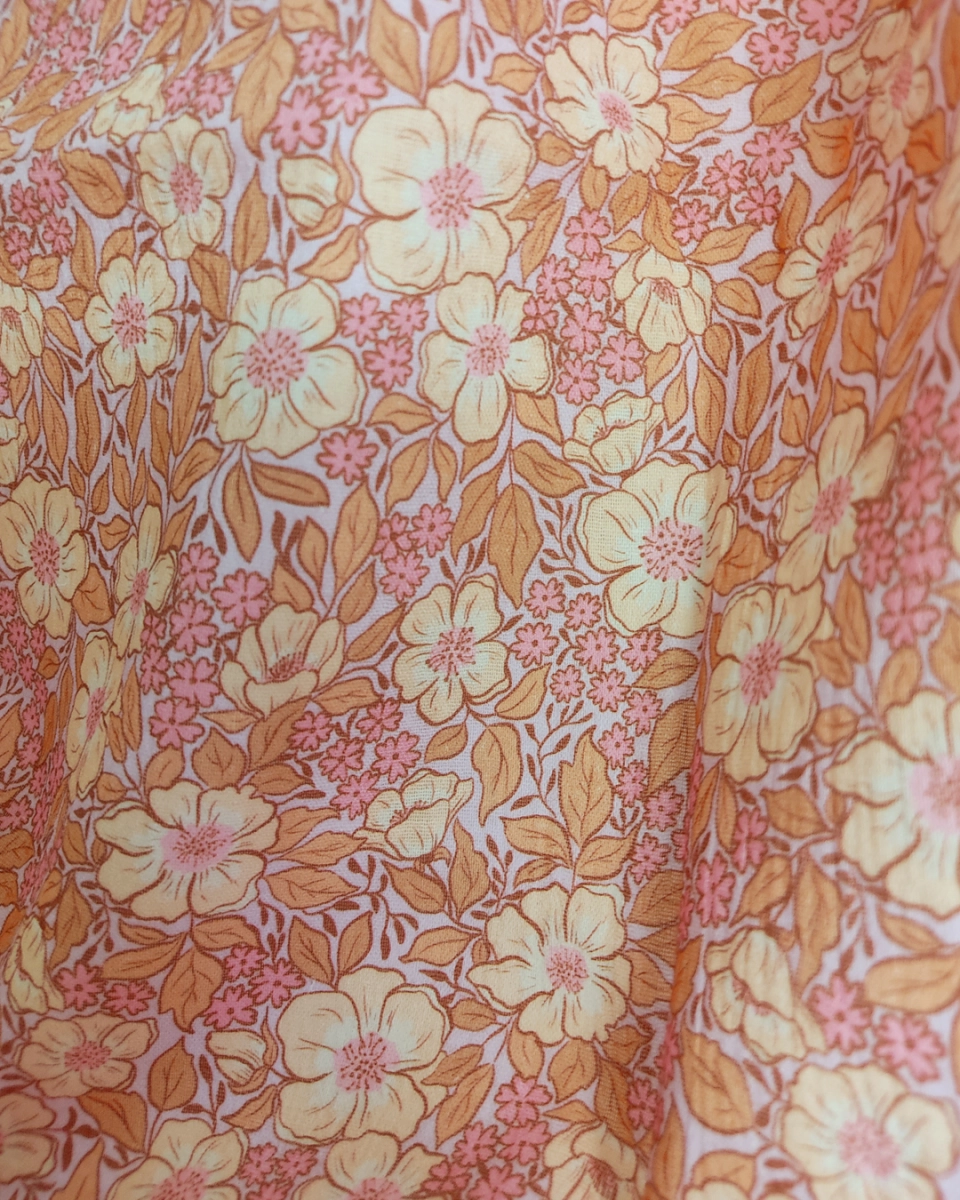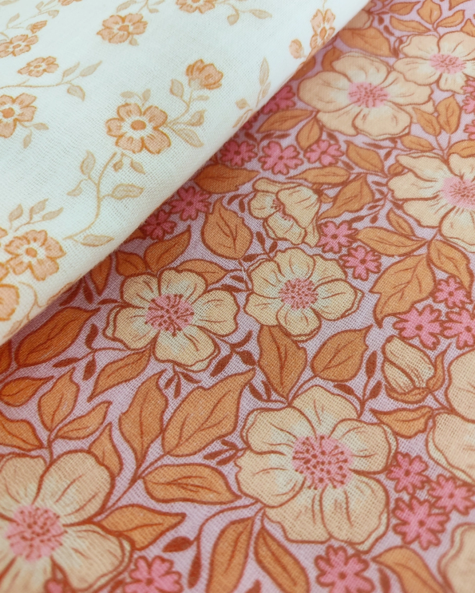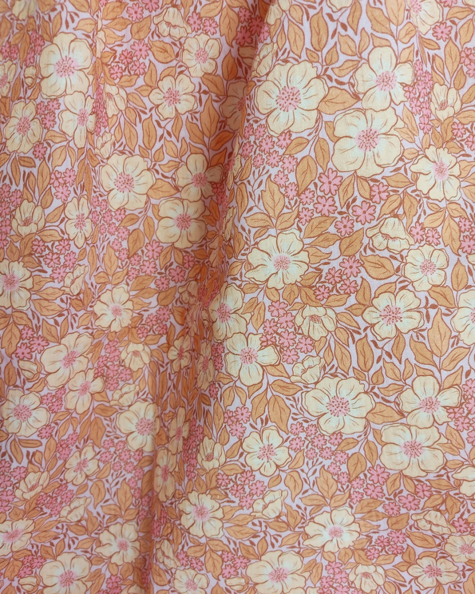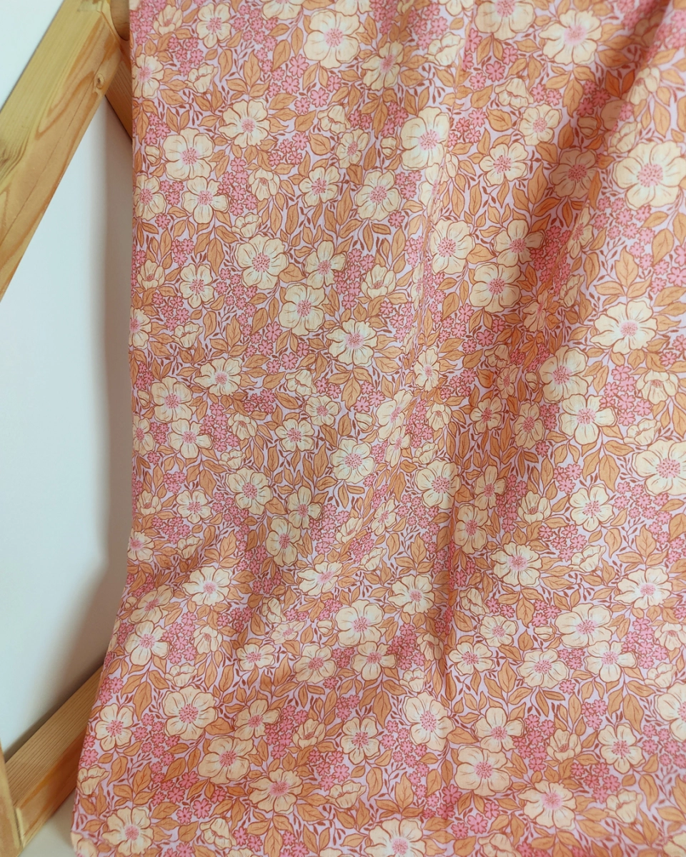Boho floral fabric in lilac, peach and pink colors - perfect for baby and lady clothing, tops, dresses, blankets, girl and woman accessories.